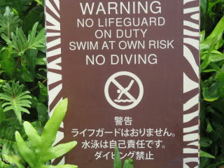 写真C、Dは、ハワイ・ワイキキの有名ホテルのプールと、その近くに置いてあった掲示板です。『警告 ライフガードはおりません。水泳は自己責任です』と、日本語で書かれていました。