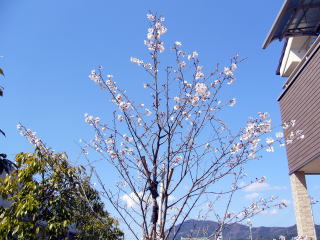 うちの桜も、このあたりの桜より少し遅れて先月の20日ごろに開花しました。植えてまだ半年くらいの木だからでしょうか、一つの枝についている花の数が少なく、花びらのピンクの色がソメイヨシノにしてはやや薄い感じがします。でも、じっと見ていると、「この地へ来てよかった。」「何かいいことがありそうだ」と思わせてくれます。