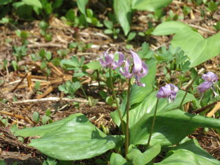 | 苗場山のふもとの水芭蕉(新潟県湯沢町 2018) | 八海山ロープウェイ乗り場近くのカタクリの花(新潟県 南魚沼市 2018) |