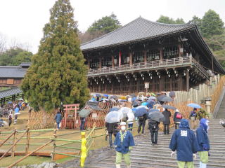 奈良ホテルに着いて、部屋まで案内してくれた係の男性が「お水取りは今日が最終日です。行かれたらいいですよ。タクシーを呼んでおきましょうか」と話してくれました。外は土砂降りの雨になっていました。その日は3時間しか寝てなかったので、昼寝をしました。迎えのタクシーが来る時間に玄関に降りていくと、タクシーに雪が積もっているように見えました。近くでよく見ると、氷の塊(あられ、ひょう)でした。運転手に「二月堂まで行くけど、この天気だから、写真を撮ったらすぐ帰ってこようと思う」と伝えました。出発してしばらくすると、雨、あられがやんできました。運転手さんが「お客さん、ぜひ見てください。年に1回のことですから。今日はお松明(おたいまつ)が短い時間でそろいますから」と何度も言ってくれました。気温は7℃。最後までいました。
