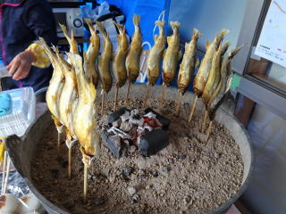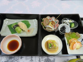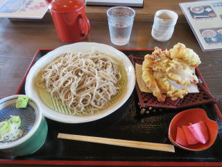 | 「芭蕉庵」の手打ちそば(最上郡戸沢村 7月24日) | 遊覧船「芭蕉丸」の中で食べたアユ(7月24日) |