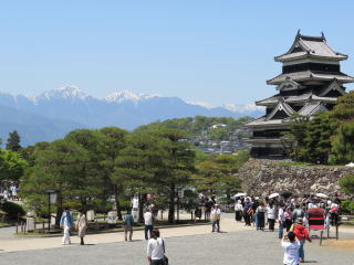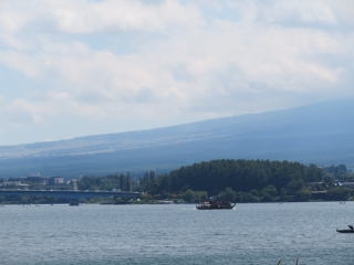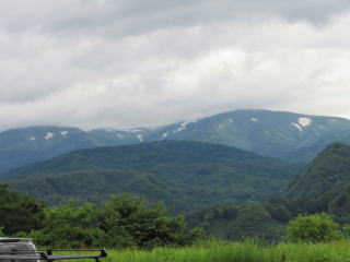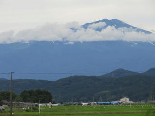 その名句と季節がほぼ同じでした。芭蕉になった気分で最上川の舟下りをしました。舟を降りて、車で酒田市まで行きました。庄内平野と最上川、その向こうには日本海が見えました。雲がかかった鳥海山(ちょうかいさん)がすぐ北にありました。どっしりとしていました。山形自動車道で山形市方面に戻る途中、月山(がっさん)が見えました。7月終わりでも雪が残っていました。