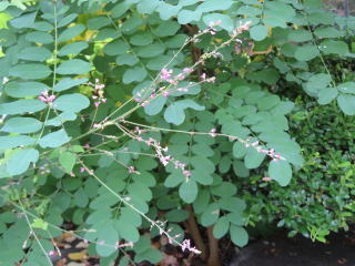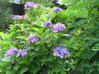 翌日、上山市の料亭の庭であじさいと、秋の七草の一つ萩の花を見ました。同じ所に並んで咲いていました。山形地方は梅雨がまだ明けておらず、きれいな青いあじさいをよく目にしました。