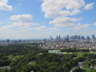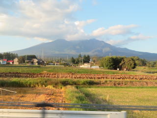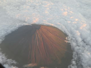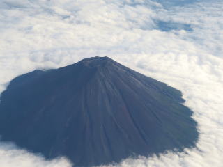 ホテルの部屋から迎賓館、国立競技場、新宿の高層ビルなどが見えました。秋晴れの良い景色でした。本来この方角に富士山がありますが、残念なことに今回は雲に隠れて見えませんでした。でも、帰りの飛行機の中から富士山をしっかりと眺めることができました。ふわふわの白い絨毯のような雲の中から黒っぽい富士山が出ていました。富士山は玄武岩が多いので、雪がなければ黒く見えます。山頂火口の上からこの山の姿かたち・色を観察すると「やはり火山。いつかは噴火する」と思いました。