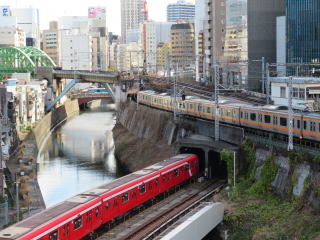 その先に御茶ノ水駅があります。駅の手前の聖橋(ひじりばし)を歩いている時、地下鉄丸の内線の電車が見えました。地下鉄電車を地上から見るのは珍しいです。ここは中央線(快速)、総武線(各駅停車)、地下鉄丸の内線の3路線の電車の立体交差が見える有名なスポットです。湯島天神からここまで1本道です。道沿いにうちの子が以前住んでいたマンションがあった所で、懐かしかったです。