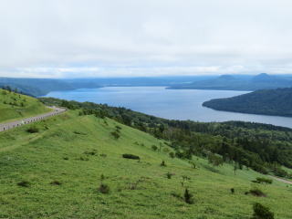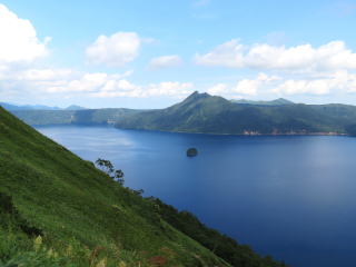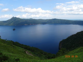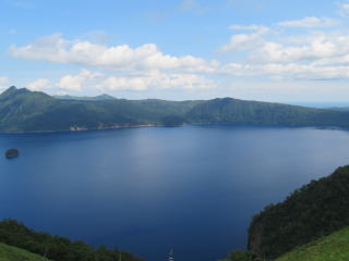 30年前に、3年続けて北海道の道央、道東を家族で旅行しました。そのうちの2回、旅の途中で摩周湖に寄りましたが、霧で湖面が見えませんでした。今回(8月9日)、天気予報では午前中は曇り、昼からは激しい雨となっていました。レンタカー店に向うタクシーの中で、運転手が「今日は、天気がもつんじゃないか」と話しました。オホーツク海沿いをレンタカーで走っている時に寄った道の駅で、ホタテを焼いているお婆さんが「今から行けば、摩周湖は見えるよ」と山の方を見て語りました。到着したのは午後1時過ぎ。下の写真のような摩周湖が目の前に現れました。感激しました。この後、硫黄山に寄って、帰途に就きました(15時過ぎ)。その頃から雨が振り出し、しだいに激しい雨になりました。濃い霧も出て、運転するのが怖かったです。タクシーの運転手、ホタテのお婆ちゃん、天気予報、みんな当たっていました。