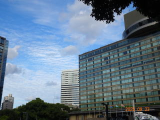 中央線の四ツ谷駅で降り、紀尾井町のホテル・ニューオータニまで外堀土手を歩きました。東京は大都会ですが、わりと緑が残っています。ふと彼岸花を見つけました。「こんな東京のど真ん中でも咲くんだ」と思いました。ちょうど秋の彼岸の中日でした。彼岸花の近くに赤いオシロイバナが咲いていました。子どもの頃よく見た花で、懐かしい感じがしました。空も秋らしくなりました。今回の休暇中はうろこ雲やひつじ雲を度々目にしました。ほんの1週間前まで愛媛では連日、入道雲が出ていました。